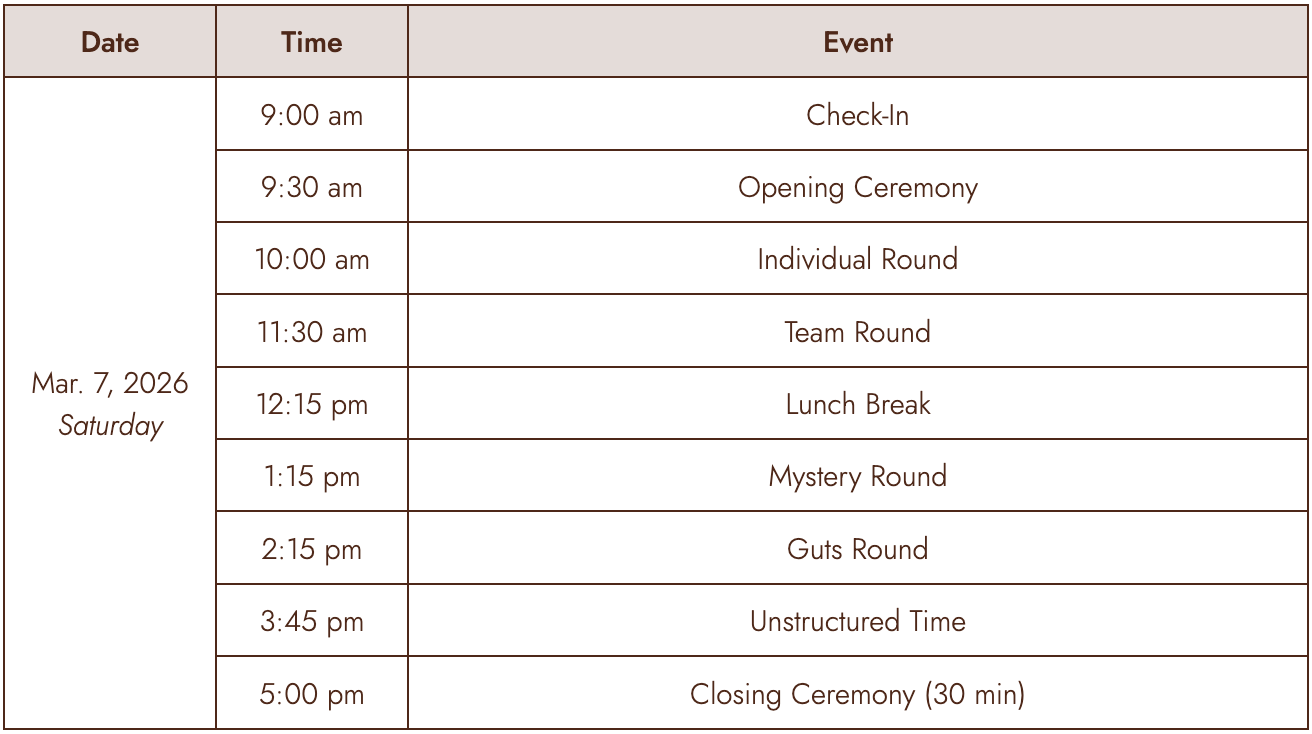 BrUMO 2026 Online is a one-day, virtual event, expected to run from 9:00 AM EST to 5:30 PM EST. It consists of a full day of testing, concluding with our Closing Ceremony to take place that night.